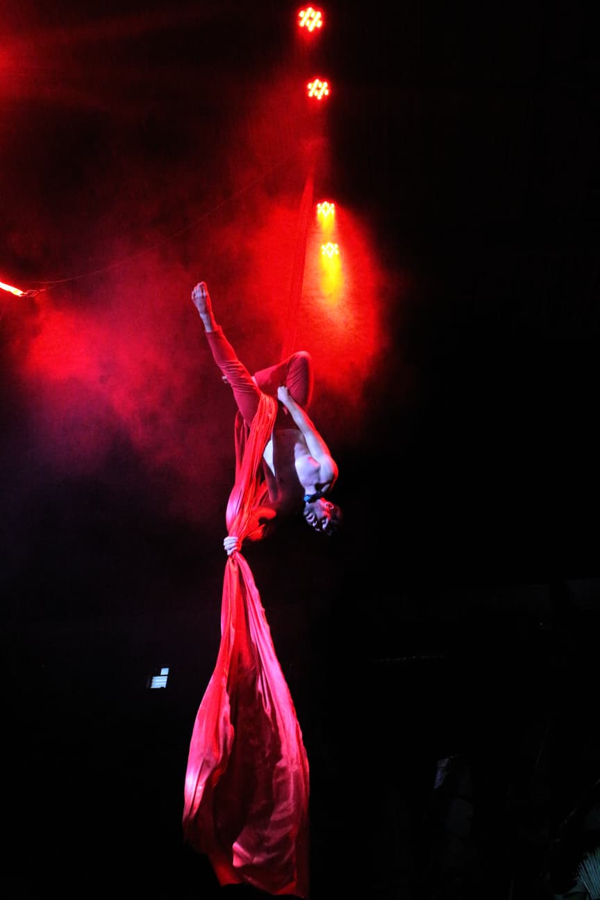 Espectáculos Aéreos: Nuestros acrobatas aéreos realizan increíbles actos suspendidos en el aire. Desde trapecios hasta aros y telas, estas actuaciones añaden un toque de gracia y audacia a cualquier evento.