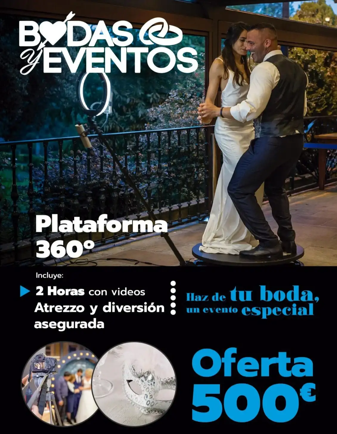 Hacemos bodas y eventos, desde la sonorización de la ceremonia, cóctel, momentos, hasta el baile y la posterior fiesta, con disco móvil. Gran equipo de sonido y iluminación Fotomatones, plataforma 360...