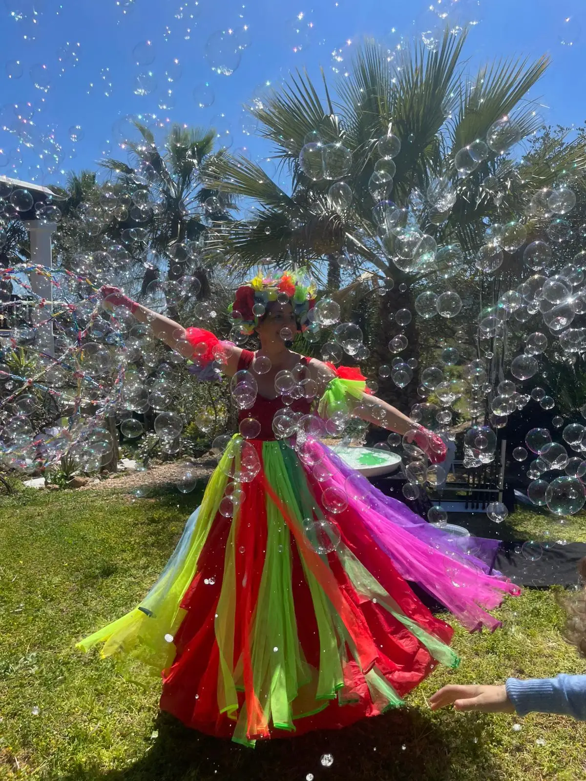 At Bimbi Magical Events, we work with professional and specialized materials to ensure high-quality shows. Our technical team is designed to create the best conditions for each bubble show and creative activities, providing beauty, safety, and a flawless finish. The setup and takedown of the equipment are always included in the service, at no additional cost. We take care of everything so that clients can enjoy without worries. As for transportation, it is included for all events within the island of Ibiza. The only exception is when the event takes place in a location where it is necessary to use public parking: in that case, the client bears the parking cost. For performances outside Ibiza, the client must cover travel expenses (transportation and equipment transport) as well as accommodation, if necessary. Thanks to our international experience and attention to detail, we guarantee a quick, orderly setup that is fully adapted to the available space. All our materials are designed to enhance the magic of the shows and turn each event into a professional and visually unforgettable experience. ---
