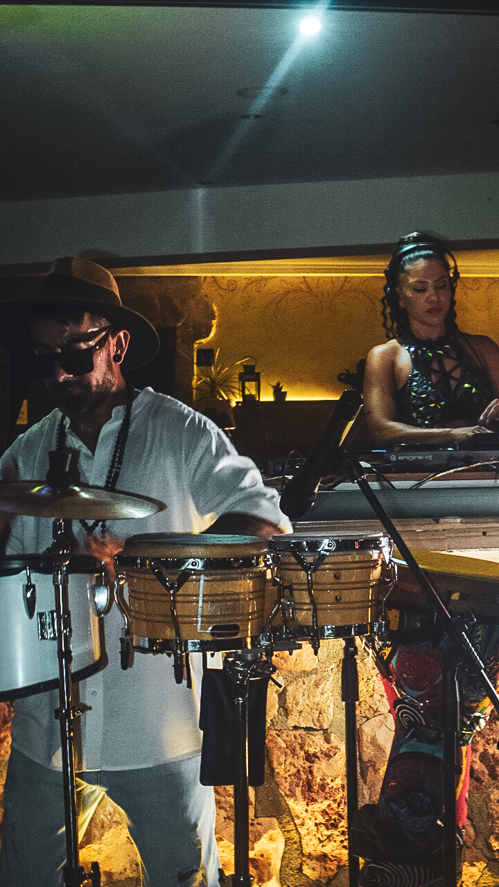 El percusionista utiliza instrumentos como bongos, congas, timbales o percusión electrónica para improvisar y adaptarse al estilo musical del momento —house, latino, comercial, afro, entre otros— aportando intensidad y espectáculo a la pista de baile.