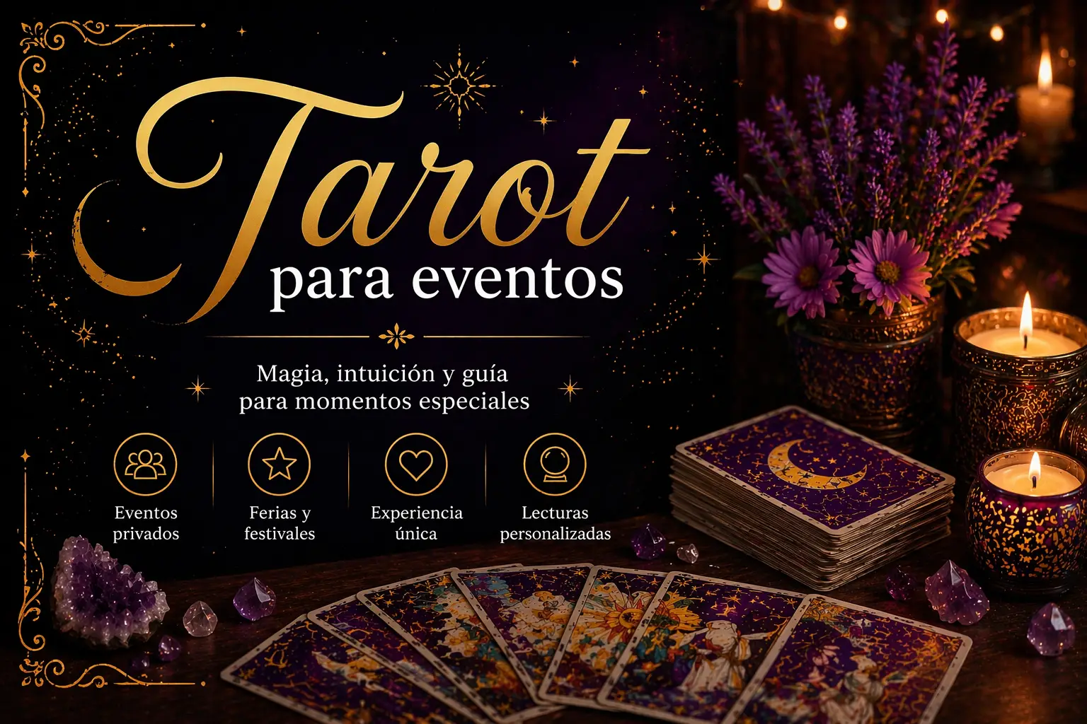 Ofrezco lecturas personales de tarot y péndulo para todo tipo de eventos: bodas, comuniones, cumpleaños, despedidas de soltera y celebraciones corporativas. Cada invitado recibe una consulta personalizada de aproximadamente 10-15 minutos en un espacio íntimo y especial, creando una experiencia única y memorable. Me presento ataviada con indumentaria medieval o acorde a la temática del evento, y el espacio de lectura se ambienta con decoración mística para transportar a los invitados a un momento de magia y reflexión.